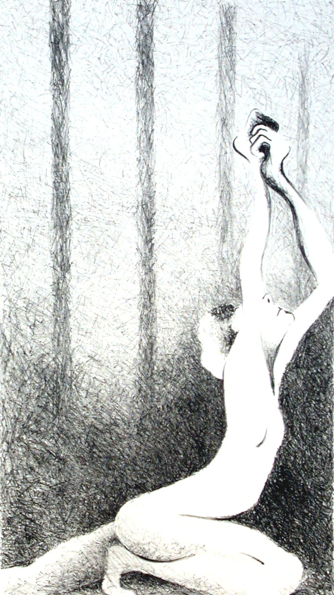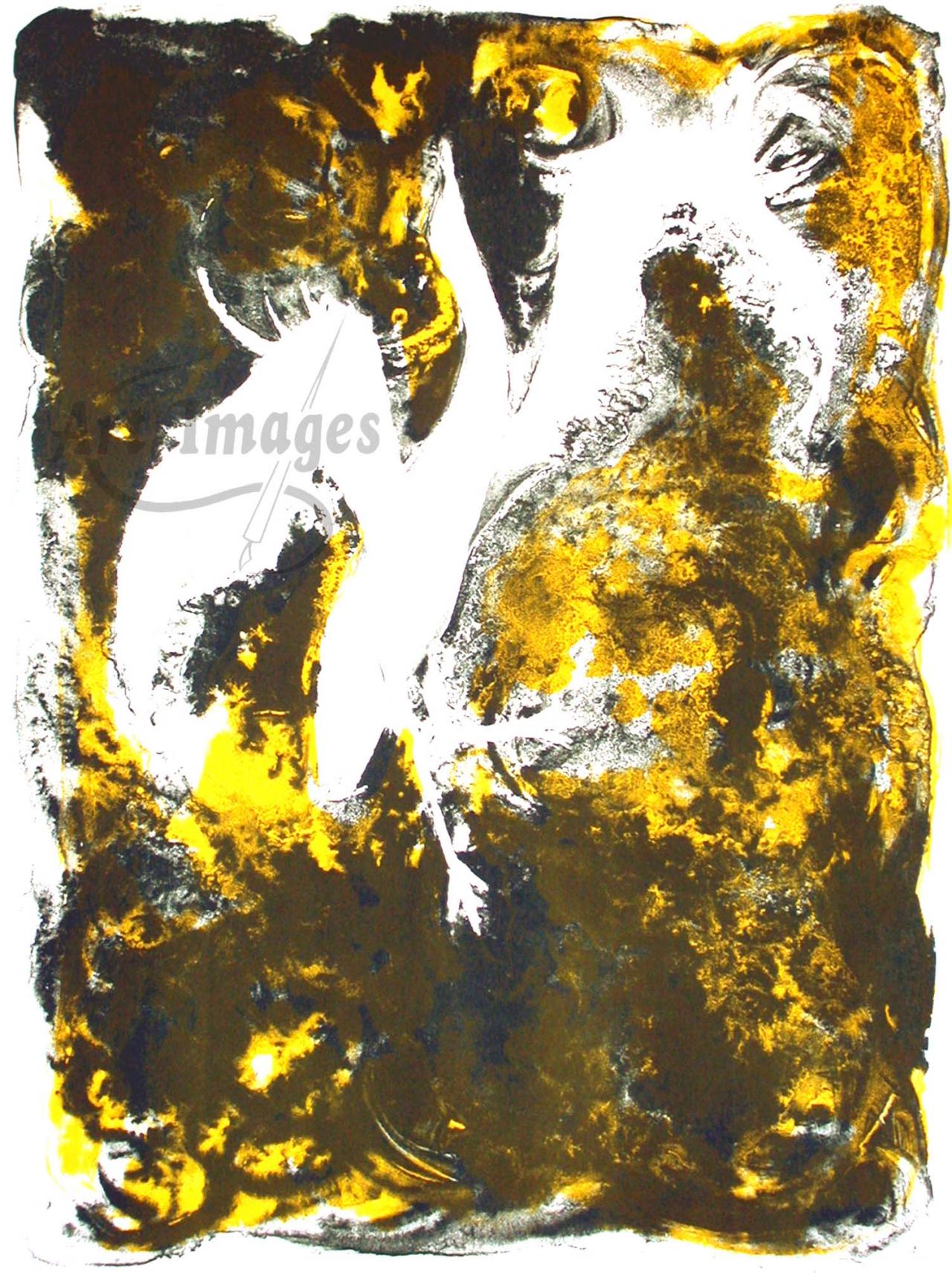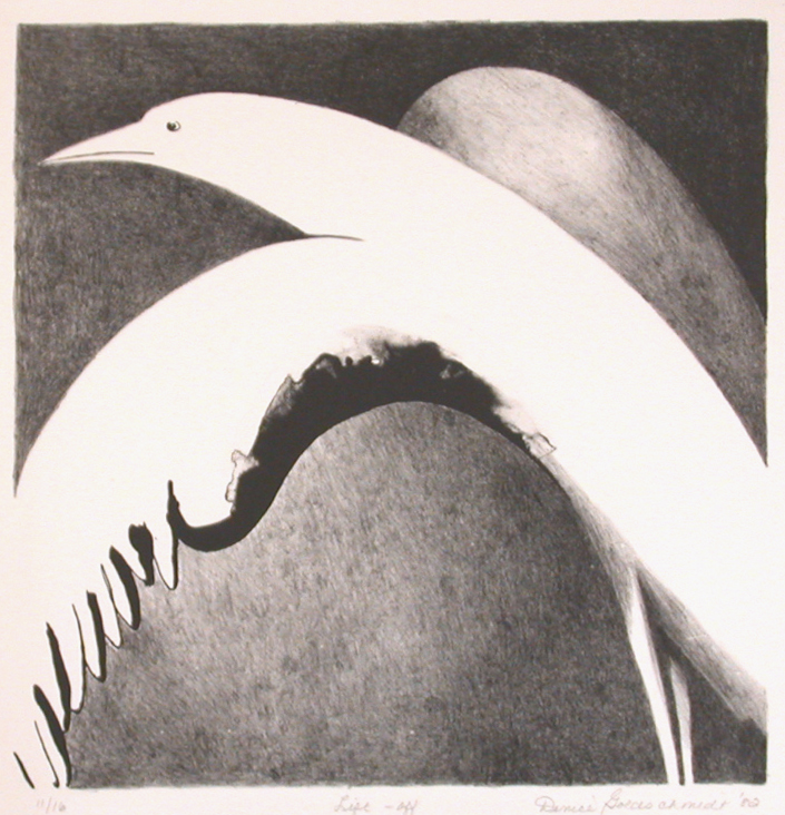 Discovered in 1796, lithography was used for printing around the 1820s. It is a method of printing from the smooth surface of flat limestone. The artist uses a grease pencil to draw the image on the stone. To make the image stable for printing, it is treated with an acid solution. During printing, the stone is kept damp with a sponge and water. When ink is rolled on the stone, the greasy image area picks up the ink and the damp non-image area repels the ink. Paper is placed over the stone and the image is transferred with a press. A separate stone is used for each color. Fine Art hand-pulled lithographs are incredibly labor-intensive and require dedication and concentration on the part of the artist. Each color of ink is hand-rolled a minimum of 16 times per print; likewise the roller requires the same number of rolls on the ink table to be recharged. To reuse the stone, the old image is ground off with grit and water. Lithographs can also be printed off metal plates, special for this purpose.